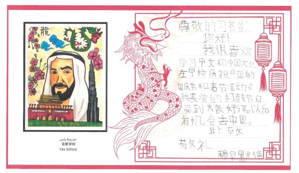 中文名叫“朱婉兒”的12年級(jí)學(xué)生朱韋雷婭在信中畫(huà)下龍與長(zhǎng)城,她說(shuō)如今學(xué)中文的阿聯(lián)酋學(xué)生越來(lái)越多,“相信中阿友好關(guān)系將會(huì)更加緊密”。