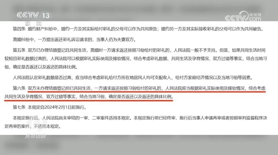 陜西省韓城市人民法院芝陽(yáng)人民法庭庭長(zhǎng)王春妮:“我們跟原告充分釋法明理,讓他知道咱們國(guó)家有新的規(guī)定,對(duì)他經(jīng)過(guò)反復(fù)做工作,他也降低了自己的心理預(yù)期。被告這邊認(rèn)為我跟你在一起共同生活了,我也是實(shí)心想跟你過(guò)日子,但是因?yàn)闆](méi)有領(lǐng)證,而且我還跟你共同生育了一個(gè)孩子,你現(xiàn)在要求我給你返還彩禮,我就不愿意返還,心里有抵抗情緒。”