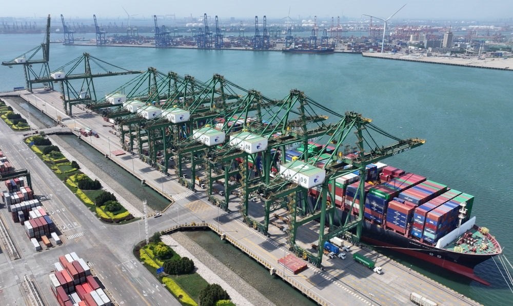 貨輪靠泊在天津港太平洋國際集裝箱碼頭裝載貨物(無人機照片,5月29日攝)。新華社記者 趙子碩 攝