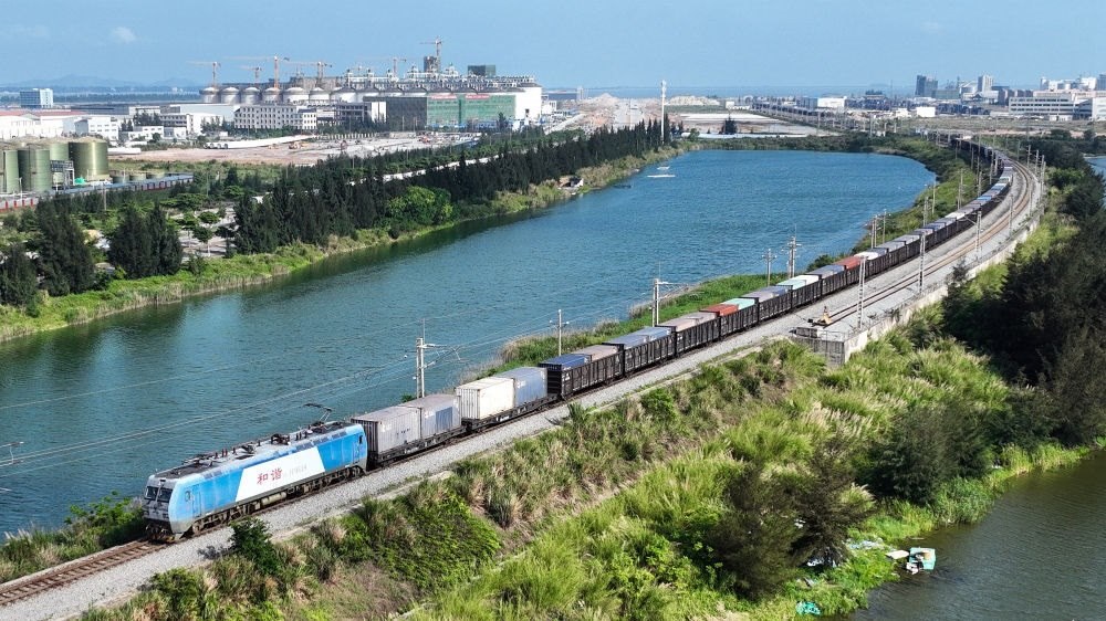 西部陸海新通道鐵海聯(lián)運班列從欽州港東站駛出(2024年5月12日攝,無人機照片)。隨著中國-東盟開放平臺建設(shè)向縱深推進,西部陸海新通道正在成為釋放開放活力的強力新引擎,以物流為切入口,促進資金、資源、人員、技術(shù)等生產(chǎn)要素深度融合。