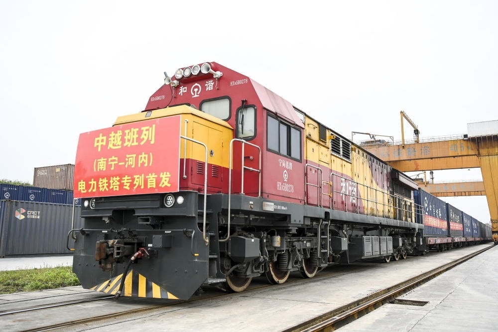 2024年3月8日,在南寧國際鐵路港,一列中越班列準(zhǔn)備發(fā)往越南河內(nèi)。西部陸海新通道鐵海聯(lián)運班列和中歐班列、中越班列、中老鐵路等相互銜接聯(lián)通,搭建起“多向延伸、海陸互聯(lián)”的運輸服務(wù)網(wǎng)絡(luò),中國西部地區(qū)面向東盟的國際大通道日趨通達(dá)。
