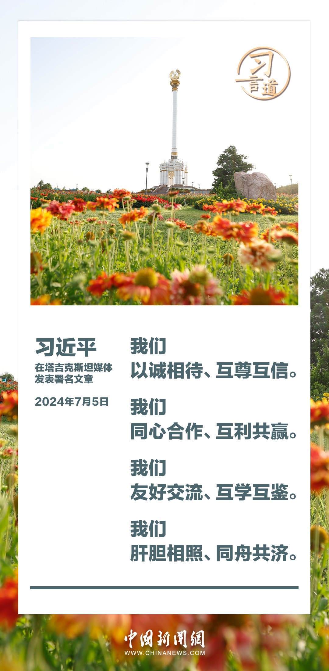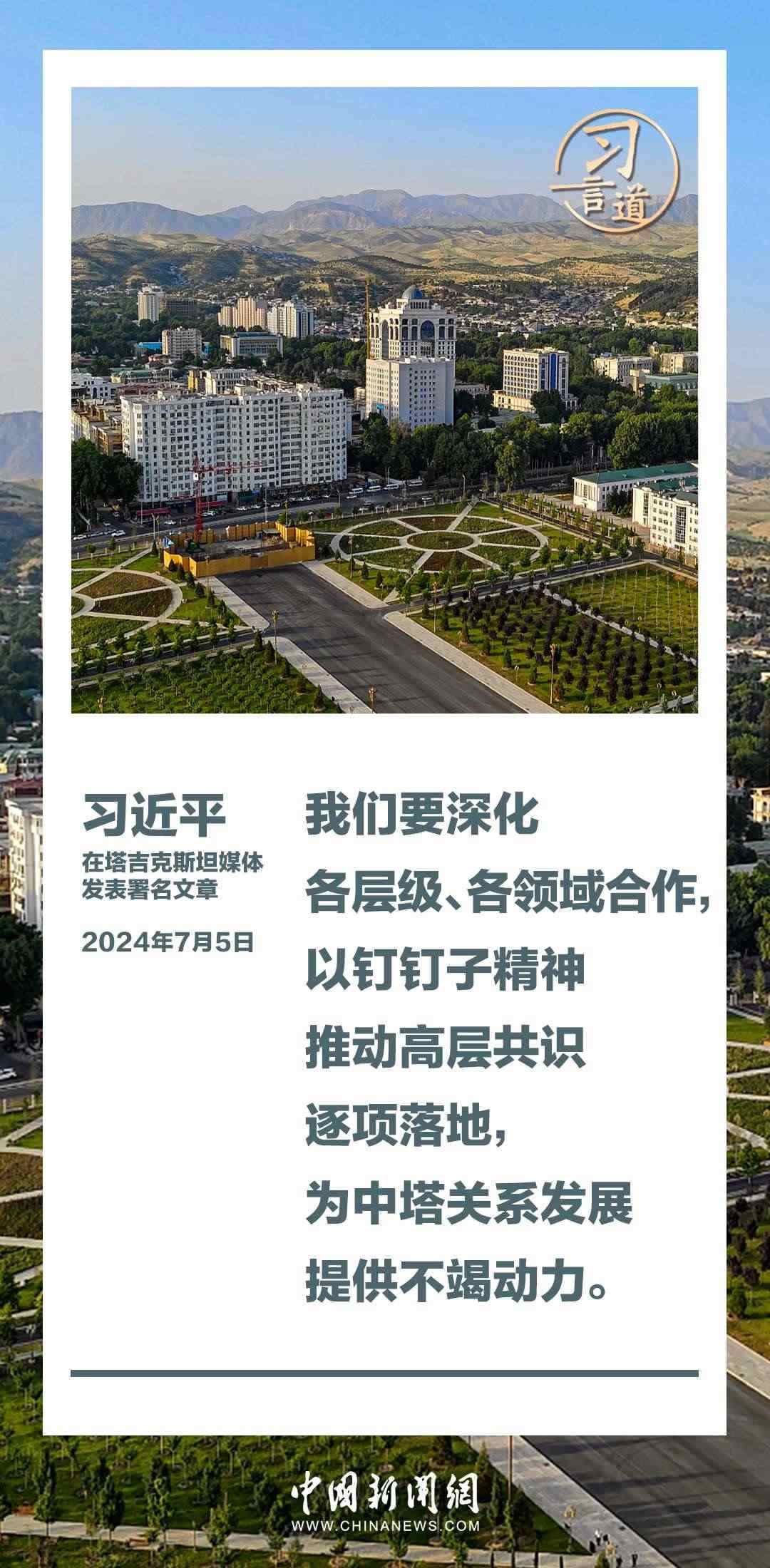 7月5日,在對塔吉克斯坦進行國事訪問之際,國家主席習近平在塔吉克斯坦《人民報》和“霍瓦爾”國家通訊社發(fā)表題為《共創(chuàng)中塔關(guān)系美好明天》的署名文章。習近平指出——