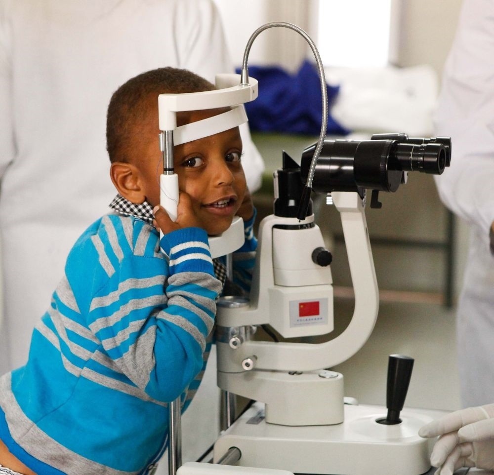 2014年5月2日,在埃塞俄比亞首都亞的斯亞貝巴的阿勒特醫(yī)院,一名小朋友等待參加“光明行”活動的中國眼科專家為他看診。