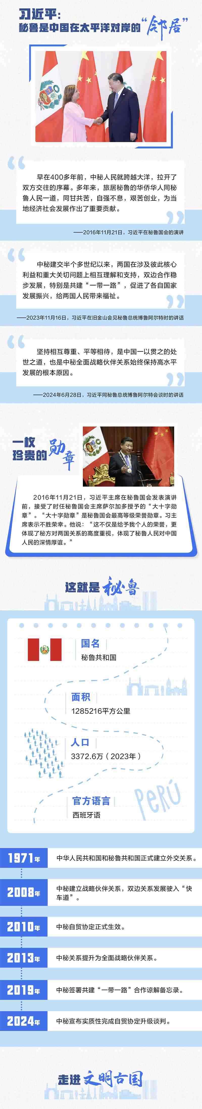 應(yīng)秘魯共和國總統(tǒng)博魯阿爾特邀請,習(xí)近平主席將對秘魯進(jìn)行國事訪問。不到半年的時間,中秘領(lǐng)導(dǎo)人實現(xiàn)互訪,顯示了雙方高水平的政治互信。