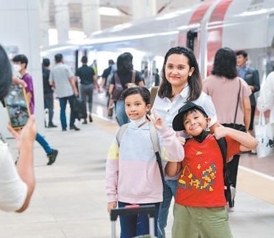 硬聯(lián)通雅萬(wàn)高鐵是我國(guó)在境外完成全過(guò)程勘察設(shè)計(jì)建設(shè)的首個(gè)高鐵項(xiàng)目,于去年10月17日正式開(kāi)通運(yùn)營(yíng),是中印尼共建“一帶一路”合作的典范。圖為乘客在和雅萬(wàn)高鐵動(dòng)車(chē)組合影留念。新華社記者 徐 欽攝