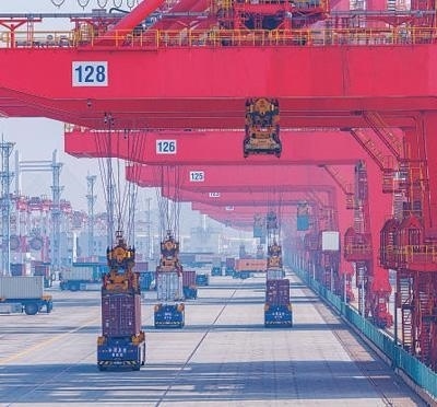 軟聯(lián)通共建“一帶一路”國(guó)家在工作制度對(duì)接、技術(shù)標(biāo)準(zhǔn)協(xié)調(diào)、檢驗(yàn)結(jié)果互認(rèn)等方面強(qiáng)化合作、統(tǒng)一標(biāo)準(zhǔn),貿(mào)易自由化便利化水平不斷提升。上海洋山港海關(guān)對(duì)接共建國(guó)家進(jìn)出口貨物相關(guān)標(biāo)準(zhǔn),推動(dòng)通關(guān)一體化方式申報(bào),提升通關(guān)效率。圖為無(wú)人駕駛的全自動(dòng)導(dǎo)引車(chē)在洋山港穿梭往來(lái),搬運(yùn)集裝箱。王 初攝(影像中國(guó))