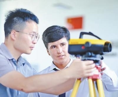 心聯(lián)通在塔吉克斯坦首都杜尚別的魯班工坊,來(lái)自天津城市建設(shè)管理職業(yè)技術(shù)學(xué)院的老師(左)為當(dāng)?shù)貙W(xué)生提供指導(dǎo)。新華社記者 鄭開(kāi)君攝