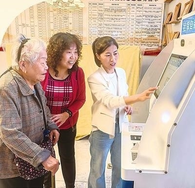 劉紅菊(右)幫助社區(qū)老人在社保自助終端辦理業(yè)務。本報記者 朱 磊攝