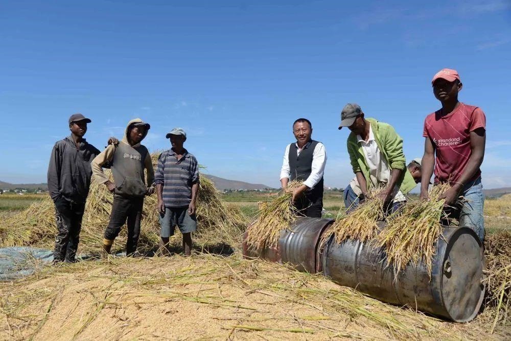 △在馬達(dá)加斯加,中國(guó)雜交水稻技術(shù)專家和當(dāng)?shù)剞r(nóng)民一起收獲水稻。
