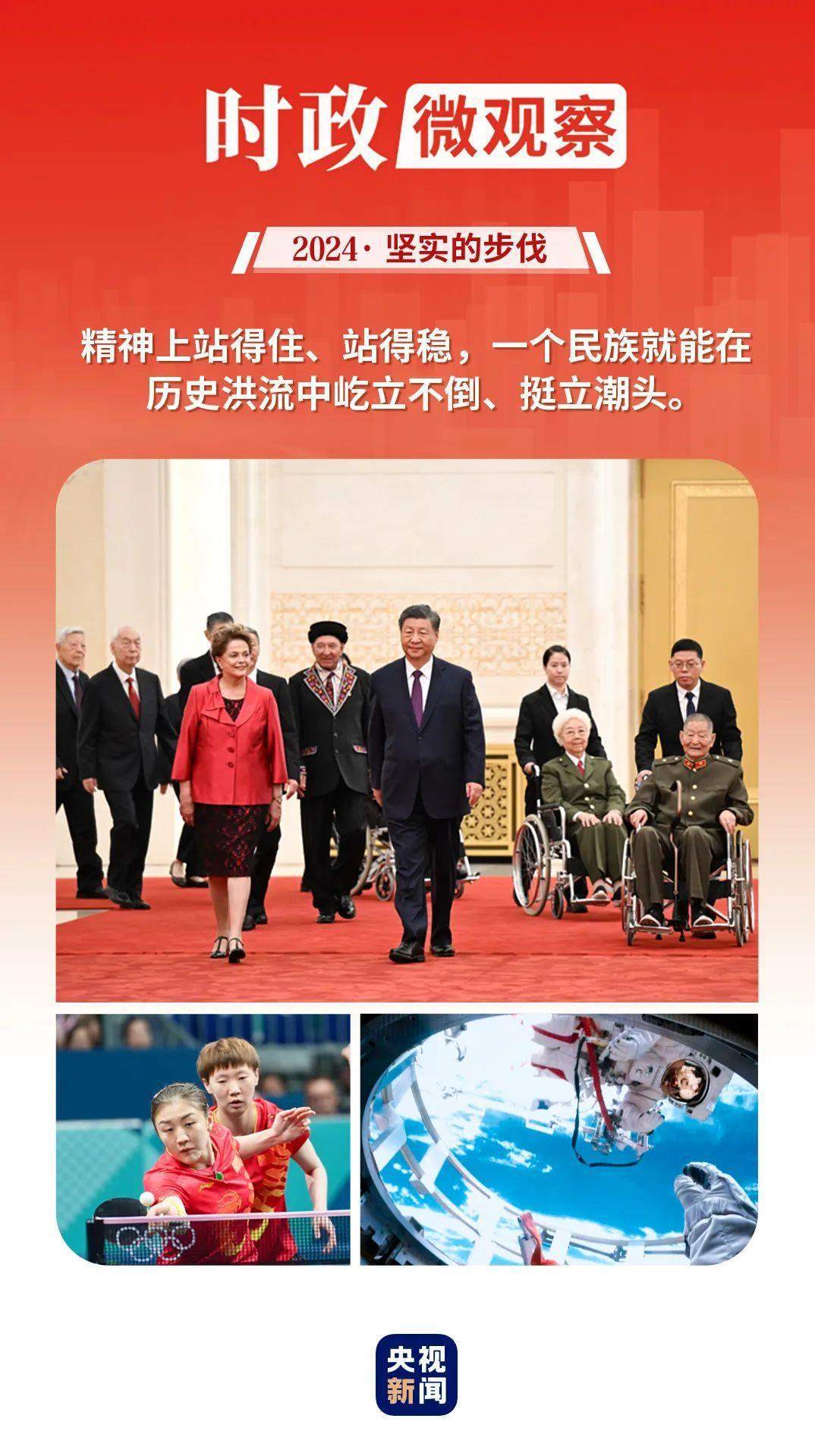 回望2024年,黨的二十屆三中全會標記下改革開放進程又一重要歷史性時刻;我們熱烈慶祝中華人民共和國成立75周年 、澳門回歸祖國25周年,匯聚砥礪前行的強大力量;中國體育代表團取得夏季奧運會境外參賽最好成績,生動詮釋了新時代中國精神;太空遨游、智能迭代、長橋飛渡、巨輪啟航,中國的創(chuàng)新動力、發(fā)展活力勃發(fā)奔涌……中國人民更加自信自強,奮斗精神更加昂揚。