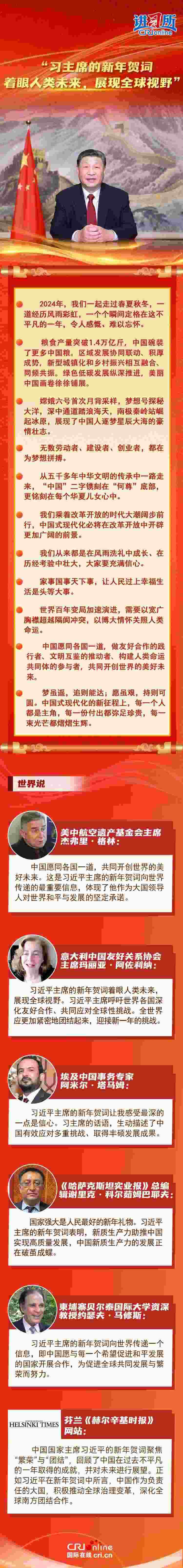 多國人士認(rèn)為,習(xí)近平主席的新年賀詞著眼人類未來,展現(xiàn)全球視野,體現(xiàn)了作為大國領(lǐng)導(dǎo)人對世界和平與發(fā)展的堅(jiān)定承諾。