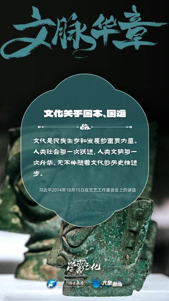 習近平總書記高度重視文化之于國家、之于民族的重大意義,強調:文化是一個國家、一個民族的靈魂。文化興國運興,文化強民族強。沒有高度的文化自信,沒有文化的繁榮興盛,就沒有中華民族偉大復興。大象新聞梳理了習近平總書記的系列重要論述,我們一起學習。
