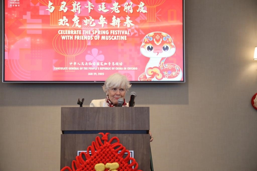 與中國有著多年情誼的艾奧瓦州友人系上了紅圍巾、紅領(lǐng)帶,和年輕人一起感受著蛇年新春的歡樂氛圍?!皩ξ襾碚f,同這么多美中兩國年輕人共慶蛇年,就是最好的慶祝方式。”蘭蒂說。