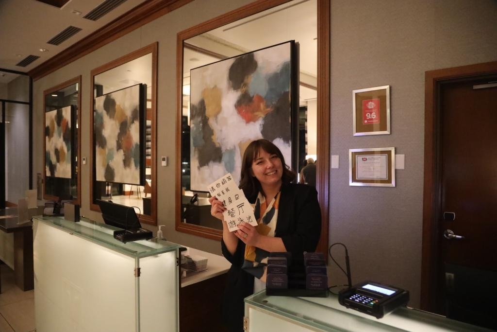 “請您稍等”“請聯(lián)系我”……在中國學(xué)生們?nèi)胱〉木频辏芭_工作人員謝伊·馬丁提前準(zhǔn)備了厚厚一疊中文指引卡片,讓很多第一次海外過年的中國小客人感到心里暖暖的。