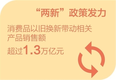 商務(wù)部新聞發(fā)言人何詠前:中央經(jīng)濟(jì)工作會議提出,大力提振消費。初步統(tǒng)計,2024年,全國汽車以舊換新超過680萬輛,超3600萬名消費者購買8大類家電以舊換新產(chǎn)品超過5600萬臺,家裝廚衛(wèi)“煥新”補(bǔ)貼產(chǎn)品約6000萬件,電動自行車以舊換新超過138萬輛。消費品以舊換新帶動相關(guān)產(chǎn)品銷售額超過1.3萬億元。