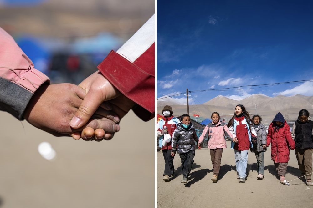 在西藏日喀則市定日縣長所鄉(xiāng)森嘎村,西部計劃志愿者周漣笛和地震災(zāi)區(qū)孩子們在一起,幫助他們疏導(dǎo)心理(拼版照片,2025年1月13日攝)。新年伊始,一場突如其來的地震打破了高原的寧靜。眾多志愿服務(wù)力量緊急奔赴,為受災(zāi)群眾帶來溫暖和力量。