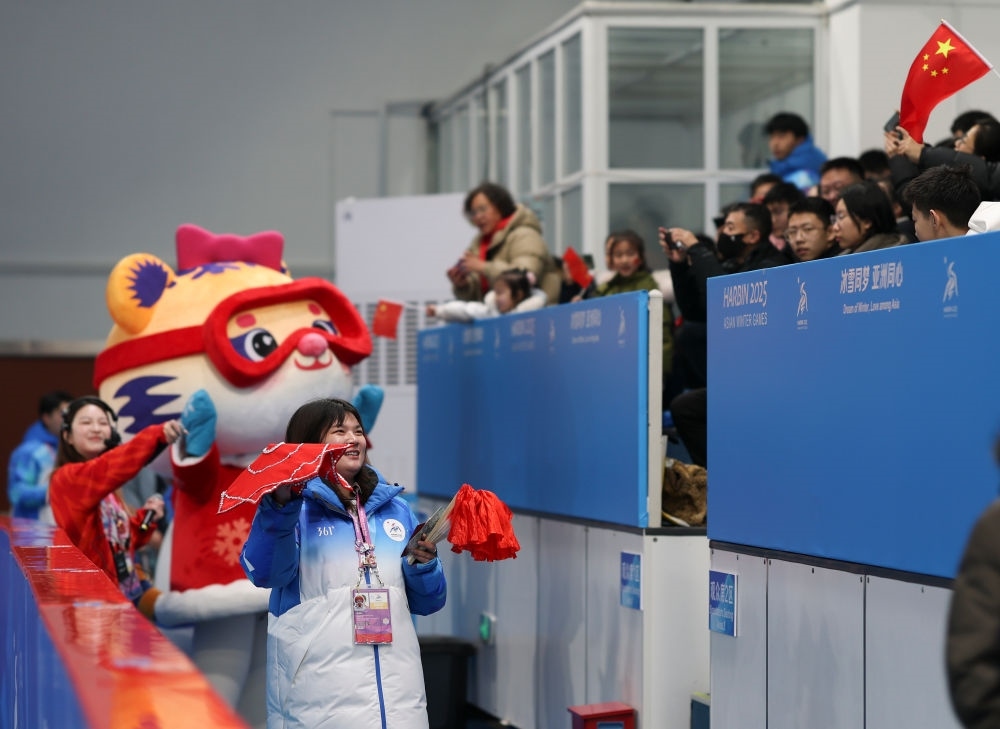 2025年2月11日,志愿者和吉祥物“妮妮”在第九屆亞冬會的一場比賽前與觀眾互動。