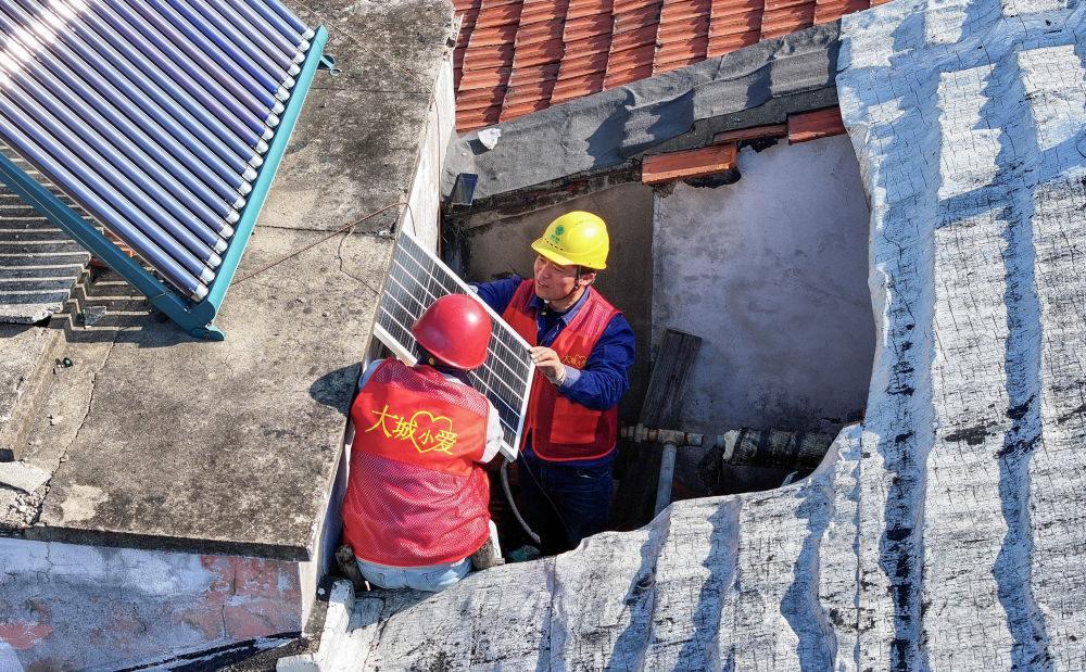 2025年3月2日,浙江余姚大城小愛公益服務(wù)中心志愿者在一老舊小區(qū)開展太陽能照明公益改造,照亮老社區(qū)居民的回家路(無人機照片)。