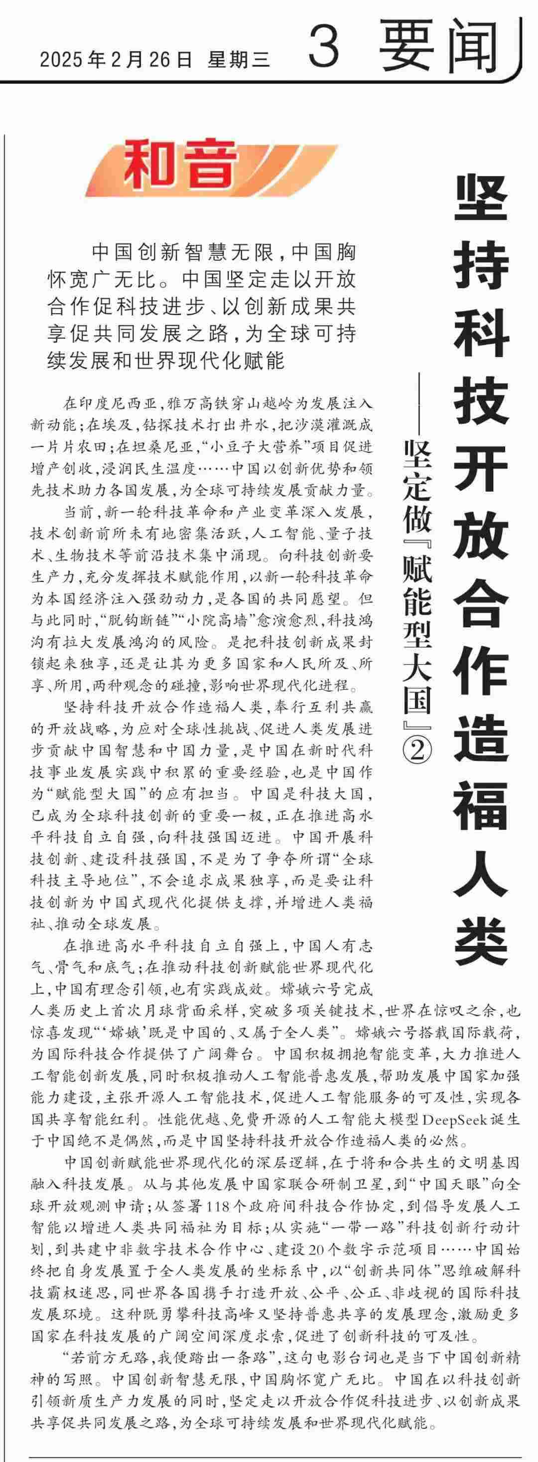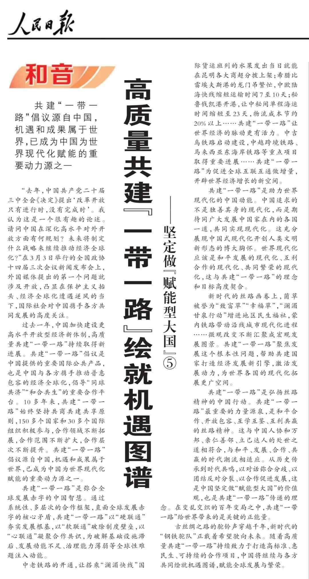 近期,《人民日報》“和音”欄目推出“堅定做‘賦能型大國’”系列評論,圍繞科技創(chuàng)新、開放共贏、綠色轉(zhuǎn)型、高質(zhì)量共建“一帶一路”、多邊治理等熱點議題,從不同角度闡釋中國何以成為一個“賦能型大國”的深層邏輯,展現(xiàn)中國始終秉持構(gòu)建人類命運共同體理念,不斷以中國式現(xiàn)代化為世界現(xiàn)代化賦能的大國擔(dān)當(dāng)。