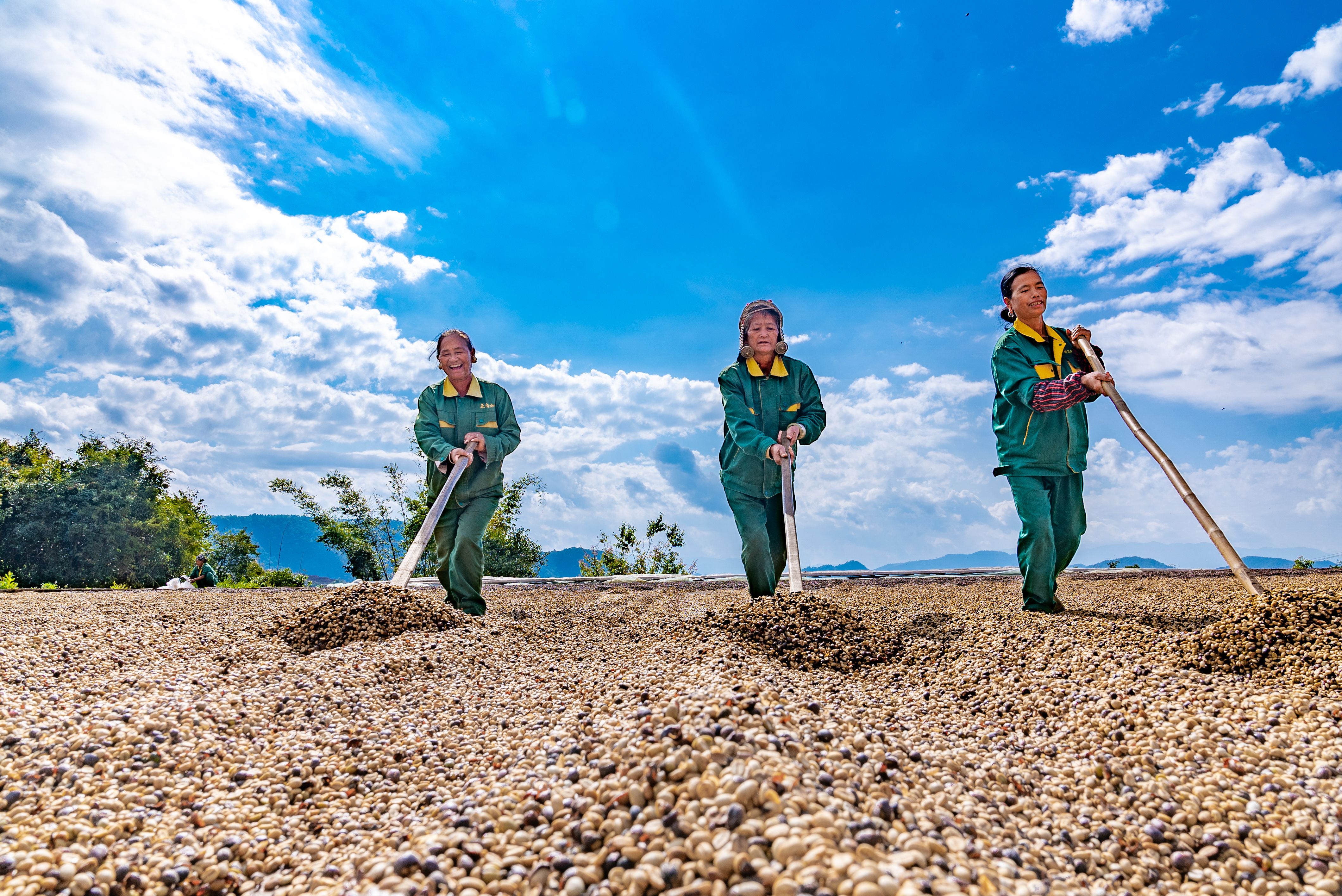 咖農(nóng)正在翻曬咖啡果。人民網(wǎng)記者虎遵會(huì)攝