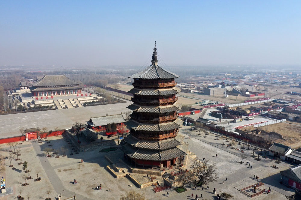 位于山西朔州市的應(yīng)縣木塔建于遼代清寧二年(1056年),塔高67.31米,上下連接的全部架構(gòu)均由卯榫咬合而成,是世界上現(xiàn)存最古老、最高大的純木結(jié)構(gòu)建筑(2025年3月7日攝,無人機照片)。