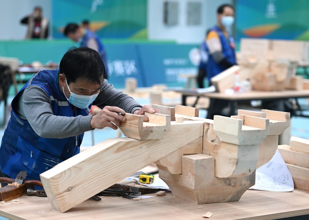 2023年3月25日,全國文物行業(yè)職業(yè)技能大賽在山西太原舉行,全國兩百余名選手現(xiàn)場比拼文物修復(fù)和考古探掘技術(shù)。這是參加木作文物修復(fù)師比賽項目的選手制作木質(zhì)傳統(tǒng)建筑構(gòu)件。