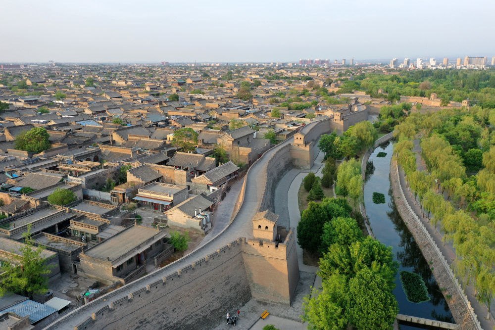 山西平遙古城城墻和護城河一角(2024年5月9日攝,無人機照片)。近年來,當(dāng)?shù)卣ㄟ^加固城墻、維護歷史建筑、逐步建立古城違建整治長效機制等措施,使這座“活著的古城”散發(fā)新的生機。