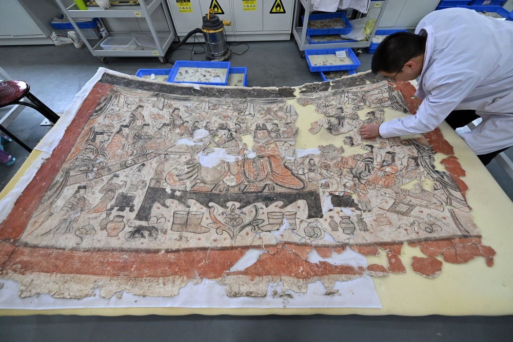 2024年2月27日,云岡研究院壁畫文物修復(fù)室工作人員王建國在修復(fù)壁畫。