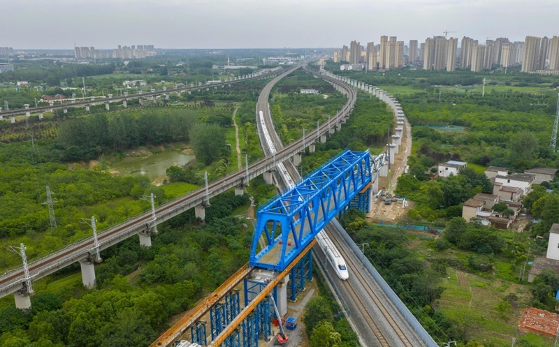 新建滬寧合高鐵鋼桁梁跨越滬蓉鐵路(6月15日攝,無人機(jī)照片)。