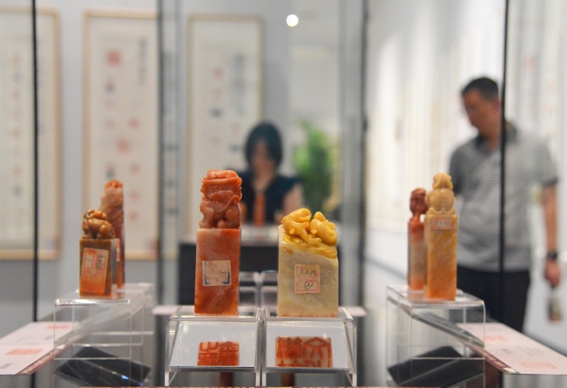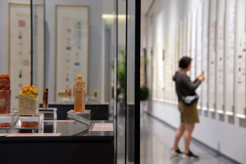 6月21日,觀眾在北京市海淀區(qū)三山五園文化藝術(shù)中心參觀薪傳國粹——“萬印樓”新藏當代國際篆刻精品展。