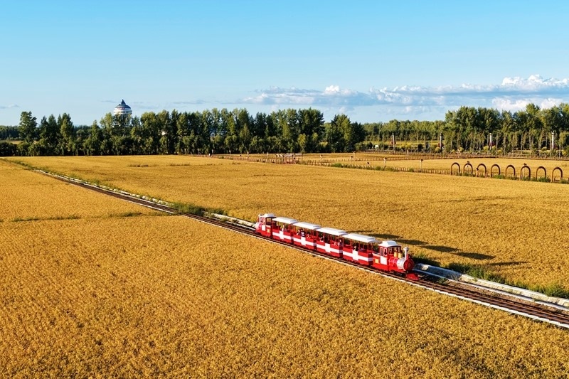 9月6日,在黑龍江省佳木斯市同江市,旅游小火車在稻田間行駛(無人機(jī)照片)。