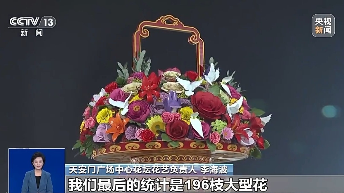 總臺記者 魏雨彤:今年的“祝福祖國”花籃籃體高16米,籃內(nèi)選取了18種美好寓意的花卉,比如說月季,首次作為焦點花寓意和平希望,向日葵寓意自由幸福。值得一提的是,今年還首次將靈動的動物元素融入其中,10只和平鴿正以三種不同的姿態(tài)翱翔于花籃之上,成為今年的新亮點。