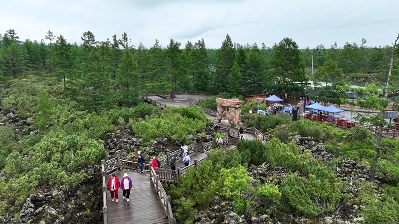 7月5日,游客在內(nèi)蒙古阿爾山國家森林公園石塘林景區(qū)游玩(無人機照片)。