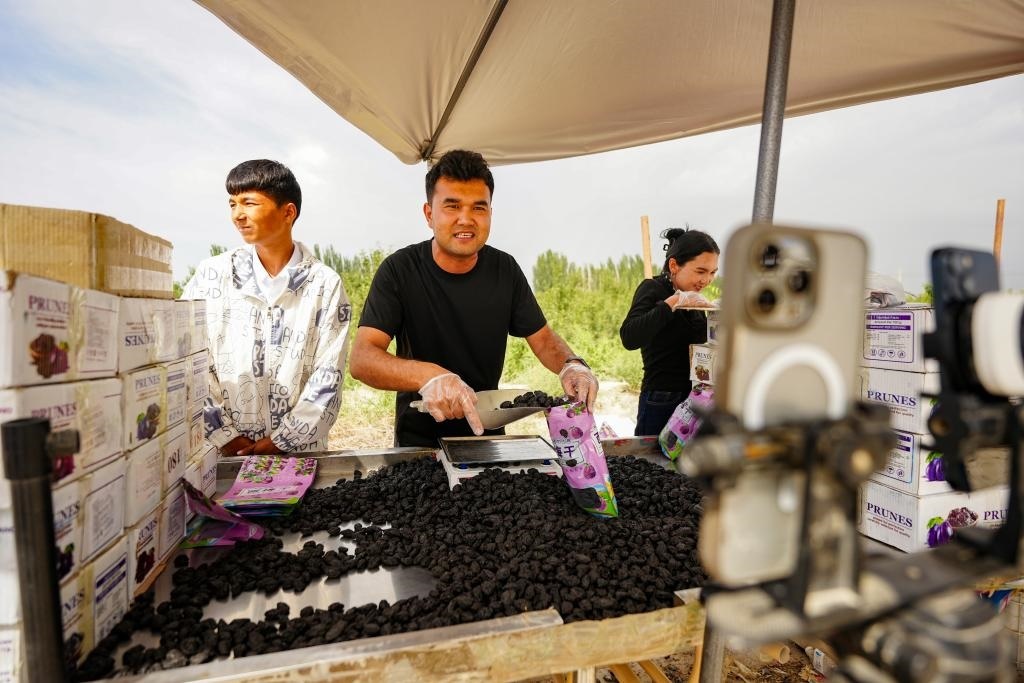 2025年6月23日,在新疆阿克蘇市新疆紅旗坡農(nóng)貿(mào)物流園,“95后”電商米爾扎提·卡米力在直播帶貨當(dāng)?shù)剞r(nóng)產(chǎn)品。新華社記者 徐宏巖 攝