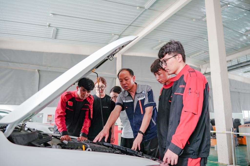 2025年6月27日,在新疆和田技師學(xué)院,北京援疆教師李寶(右三)和當(dāng)?shù)亟處熞煌笇?dǎo)學(xué)生維修汽車。新華社記者 徐宏巖 攝