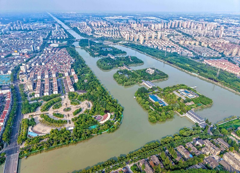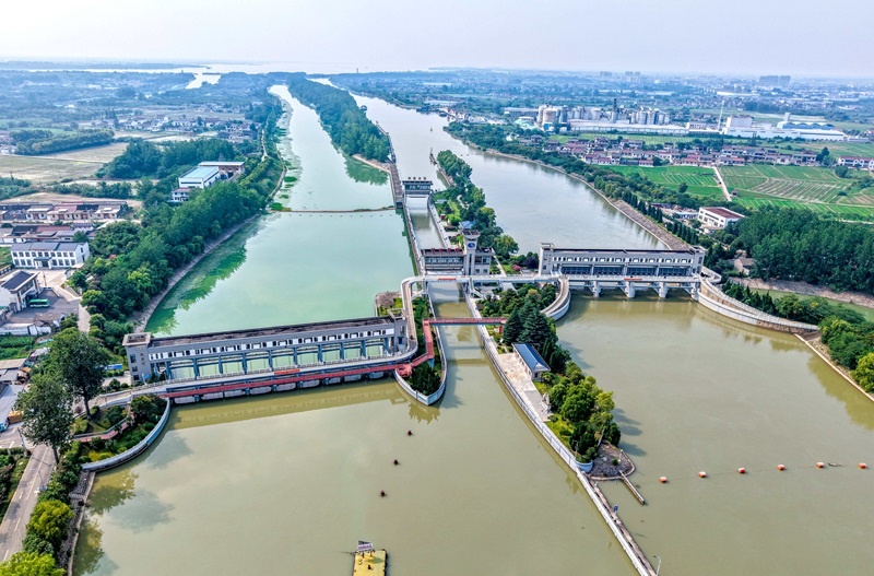 這是位于江蘇省揚(yáng)州市江都區(qū)的南水北調(diào)東線(xiàn)一期工程運(yùn)鹽閘、邵仙套閘、邵仙閘洞(7月6日攝,無(wú)人機(jī)照片)。