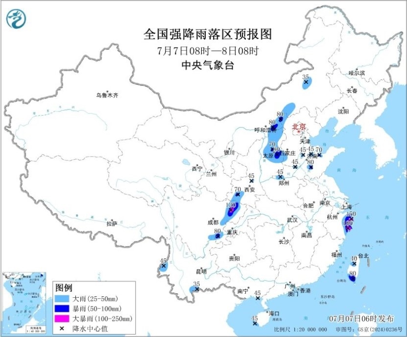 預(yù)計(jì),7月7日08時(shí)至8日08時(shí),浙江東部、內(nèi)蒙古中部、山西中北部、河北西北部和西南部、山東北部、河南西北部、陜西西南部、四川東部、云南西南部、臺(tái)灣島等地部分地區(qū)有大到暴雨,其中,浙江東部、四川東部等地部分地區(qū)有大暴雨(100~180毫米)。上述部分地區(qū)伴有短時(shí)強(qiáng)降水(最大小時(shí)降雨量20~50毫米,局地可超過70毫米),局地有雷暴大風(fēng)等強(qiáng)對(duì)流天氣。中央氣象臺(tái)7月7日06時(shí)繼續(xù)發(fā)布暴雨藍(lán)色預(yù)警。