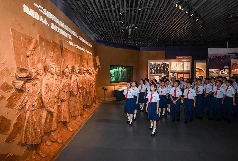 7月7日,北京市第十二中學(xué)的少先隊員參觀主題展覽。