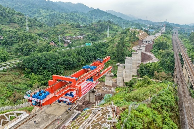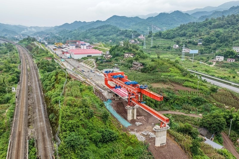 當(dāng)日,中鐵十四局工人將首孔長(zhǎng)24.6米、重542噸的箱梁架設(shè)在西渝高鐵重慶段陳家溝特大橋第一孔橋墩上,標(biāo)志著西渝高鐵重慶段箱梁架設(shè)施工正式啟動(dòng)。