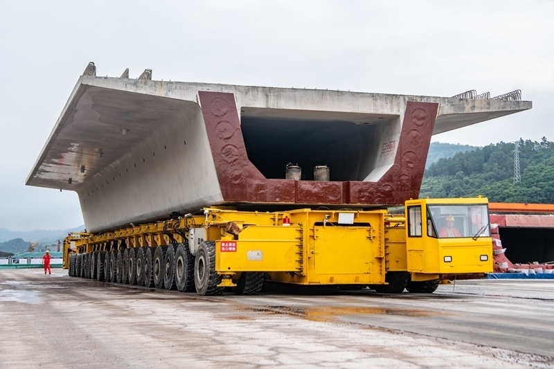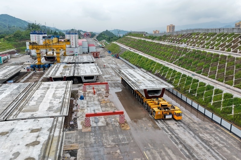 7月10日,在西渝高鐵陳家溝特大橋附近的制梁場(chǎng),運(yùn)梁機(jī)在進(jìn)行箱梁轉(zhuǎn)運(yùn)作業(yè)。