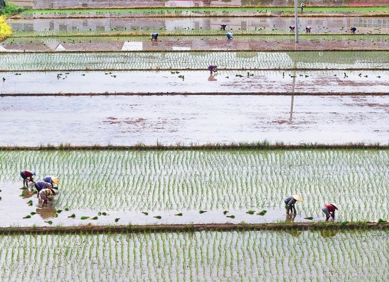 7月13日,湖南省衡陽市衡東縣霞流鎮(zhèn)農(nóng)民在搶插晚稻(無人機(jī)照片)。