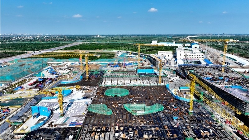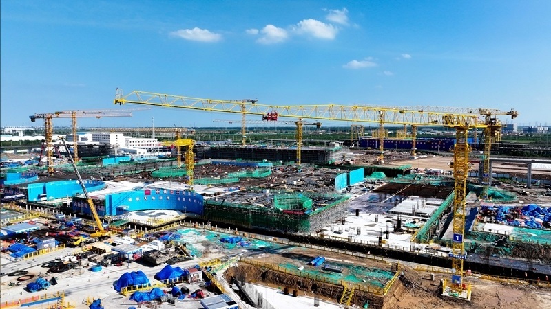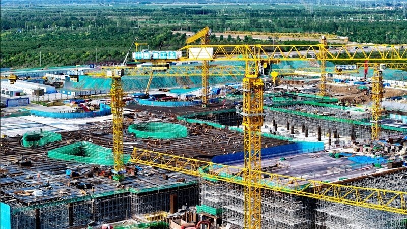 7月25日,在津濰高鐵山東東營高鐵站現(xiàn)代綜合客運樞紐及配套工程建設(shè)現(xiàn)場,中鐵二十局工作人員在施工(無人機照片)。