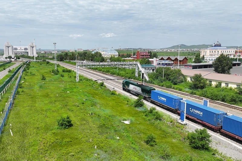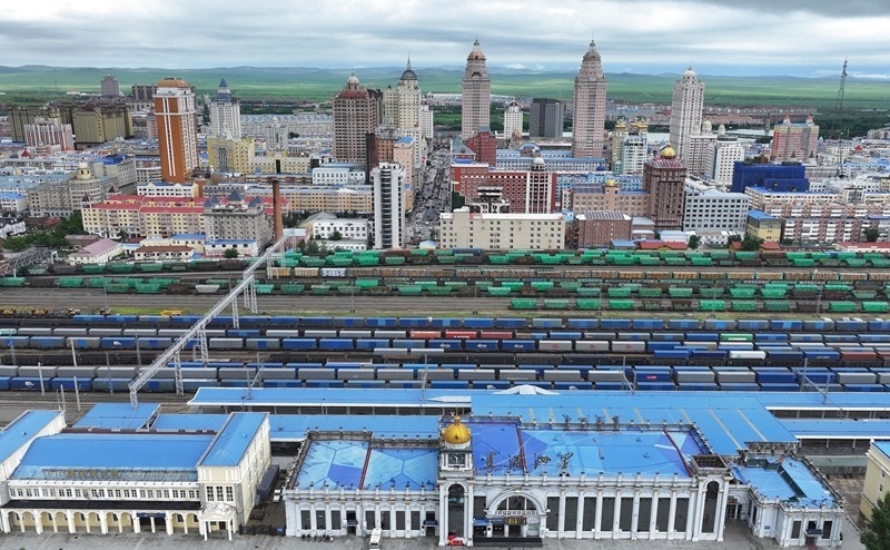 7月24日,一列滿載貨物的中歐班列從中國(guó)鐵路哈爾濱局集團(tuán)有限公司滿洲里站駛出國(guó)門(無(wú)人機(jī)照片)。