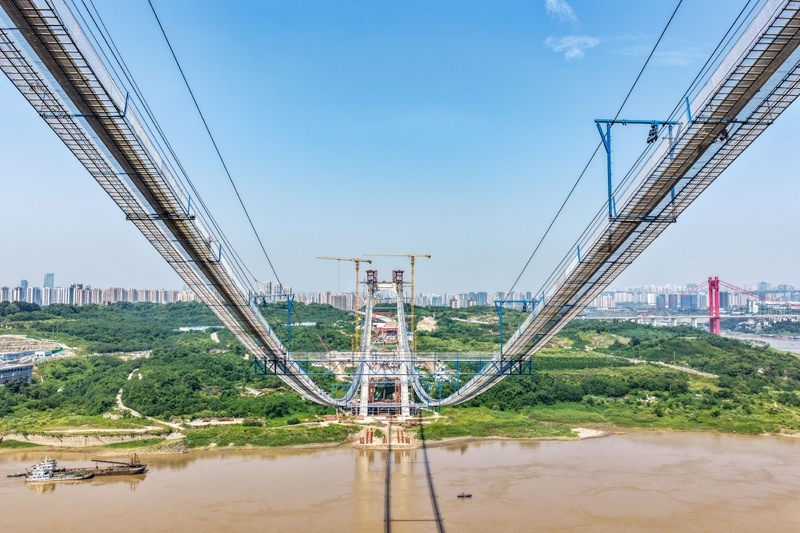 當(dāng)日,由重慶城投集團(tuán)投資、城投建設(shè)公司組織建設(shè)、中國鐵建大橋局承建的黃桷沱長江大橋順利完成主纜架設(shè)工作,標(biāo)志著大橋建設(shè)即將進(jìn)入鋼桁梁吊裝工序。黃桷沱長江大橋全長1260米,主跨765米,為單跨懸吊雙塔三跨連續(xù)鋼桁梁懸索橋,是國內(nèi)最大跨徑公軌兩用懸索橋。黃桷沱長江大橋是渝長高速復(fù)線連接道工程的控制性節(jié)點(diǎn)工程,建成后將成為聯(lián)系重慶主城區(qū)長江南北兩岸的重要交通干道。