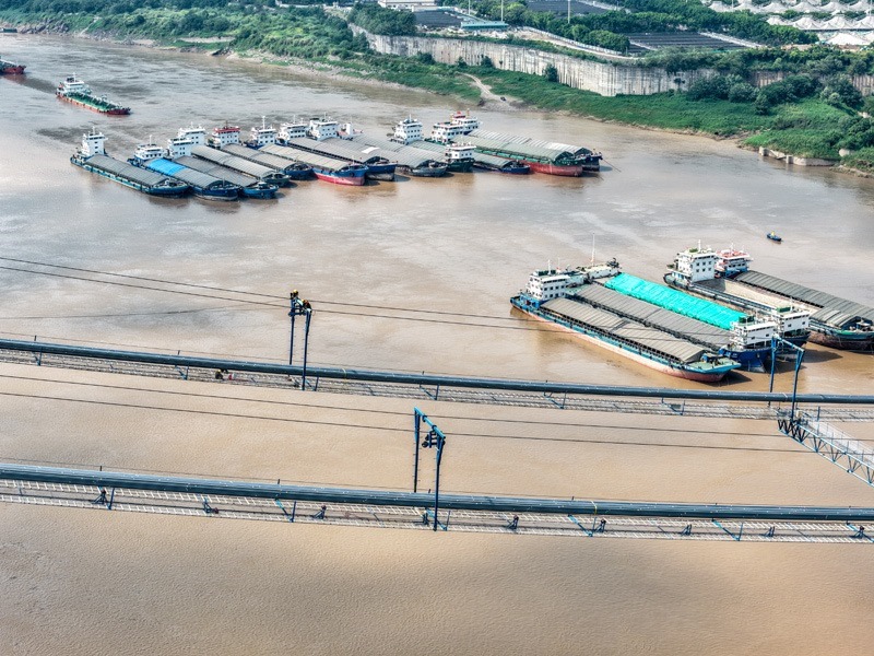 7月30日,在重慶黃桷沱長江大橋建設(shè)現(xiàn)場,工人在施工作業(yè)(無人機(jī)照片)。