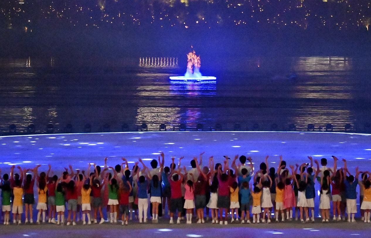 宣布開幕瞬間,象征世運(yùn)會會徽和“World”的“W”造型焰火點(diǎn)亮夜空;極具創(chuàng)意和挑戰(zhàn)的點(diǎn)火儀式,火炬“竹夢”成功點(diǎn)燃世運(yùn)會首個“水火相融”于湖中的火炬塔,絢爛的火焰交相輝映。