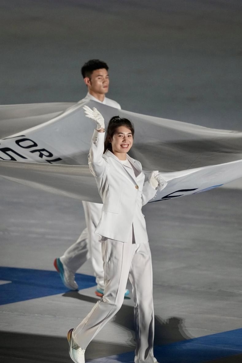 開幕式在《繽紛之約》表演中拉開序幕,街舞與輪滑、滑板、啦啦操等運(yùn)動元素碰撞出青春火花激情開場。倒計(jì)時焰火組成的篆體“成都”字樣,將傳統(tǒng)文化與現(xiàn)代科技巧妙結(jié)合。來自全球的運(yùn)動員在吉祥物“蜀寶”“錦仔”的歡迎下入場,手持融入蜀繡、漆藝等非遺工藝的引導(dǎo)牌,踏上榮耀之路。