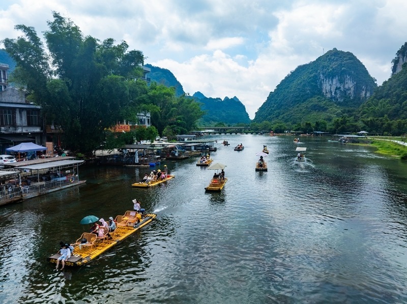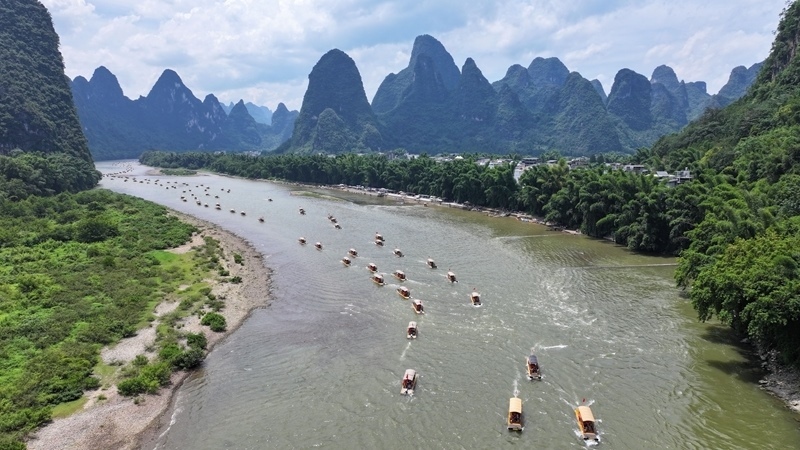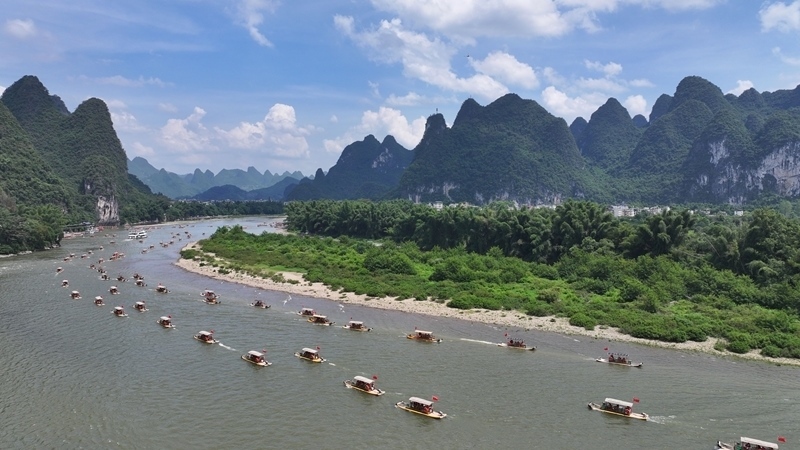 8月10日,在漓江廣西桂林市陽(yáng)朔縣興坪鎮(zhèn)段,游客乘竹筏游玩賞景(無(wú)人機(jī)照片)。