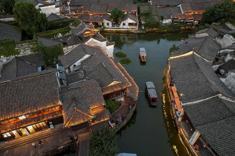 8月9日傍晚,游客在浙江省湖州市德清縣新市古鎮(zhèn)游玩(無(wú)人機(jī)照片)。