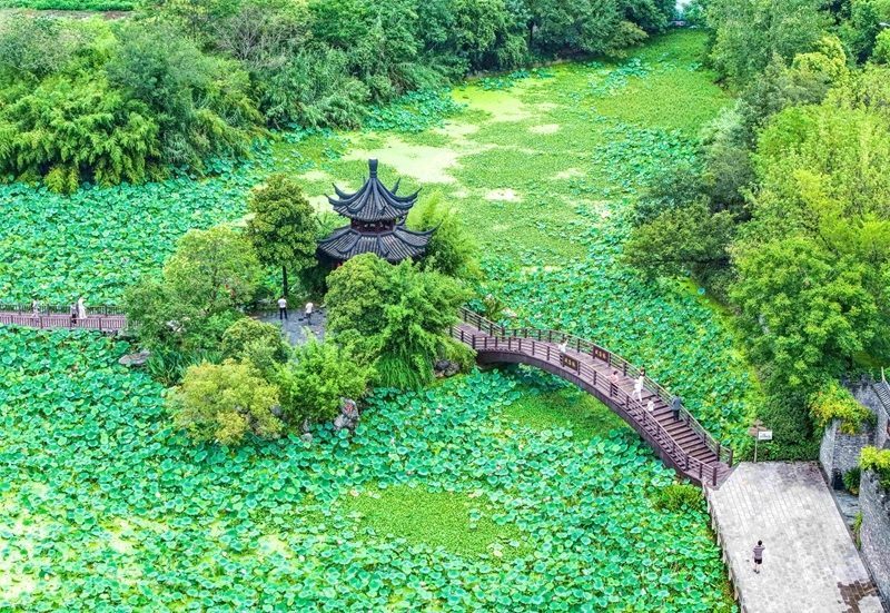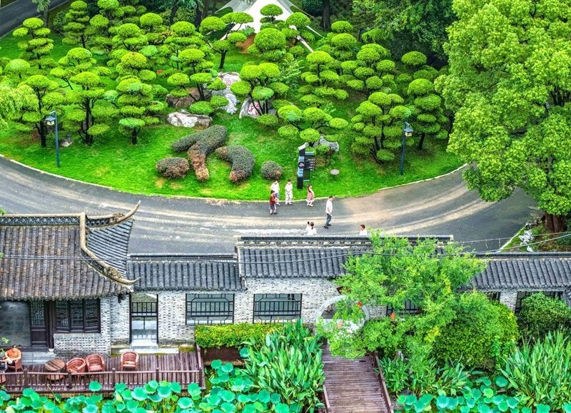 8月10日,游客在江蘇省揚(yáng)州市江都區(qū)丁伙鎮(zhèn)樸園游玩(無(wú)人機(jī)照片)。